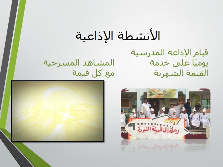إضافة للأنشطة الإذاعية الأخرى من كلمات من بعض الأساتذة شارحة للقيمة ، وحوارات طلابية ، وتدريبات عملية على الوضوء ، وإلقاء إحدى القصائد من الطلاب ، وإنشاد أحد المدرسين ، وغير ذلك