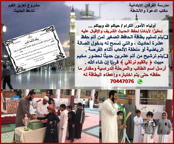 من بركات ونفحات مشروع القيم الاهتمام بحفظ سنة النبي صلى الله عليه وسلم بجانب مشروعنا الرائد تاج الوقار لحفظ كتاب الله عز وجل ومن هذا المنطلق وخطوة على طريق حفظ السنة ومساهمة في تربية النشء المسلم وتحصينه بمصادر الوحي العظيمة عمل كتيب يضم خمسين حديثًا متعلقين بالقيم المقررة للعام الثالث على التوالي ، وقد تم عمل كتيب للمرة الثانية هذا العام للطفولة المبكرة يضم خمسة وعشرين حديثًا لكل قيمة خمسة أحاديث ، وهذا النشاط يعد من أهم الأنشطة المصاحبة للقيم وأرجاها ، ومن أهدافه : تعظيم نصوص الوحي الشريف في نفوس الطلاب ، والحصول على بركة دعاء النبي ﷺ بالنضرة لحامله ، وتنمية الذكاء اللغوي وزيادة نشاط الذاكرة ، وتعزيز القيم الإسلامية وتنمية المعاني الوجدانية الراقية بمصاحبة الطالب لمدرسه في كثير من الأوقات ، وقد تمت بداية توزيع الكتاب في المعسكر الأول للحديث وقد تم وضع الخطة والشروع فيها في بداية المنتصف الثاني حيث تم تقسيم الصفوف على مجموعة من المدرسين وعمل خطة بذلك لكنها لم تستمر لكثرة أشغالهم ، ثم كانت الخطة البديلة بعد انتهاء مسابقة القرآن حيث تقدمنا بطلب للمدير بمد حصة القرآن وتخصيصها للحديث ، وانتظام جميع الطلاب في الصفوف في حفظ الأحاديث ، وأخذ المجموعات الخاصة المتقدمة للعمل بها على حدة ، كما تم عمل مسابقات في طابور الصباح لتحفيز الطلاب على الحفظ يأخذون هدايا تحفيزية بموجبها ، أيضًا متابعة أولياء الأمور بالرسائل المتتابعة لتحفيزهم ، كما تم عقد أسبوعي علمي في إجازة الربيع حضره ثلاثون طالبًا بغية الانتهاء من حفظ الكتيب ، وقد تم تنظيم المسابقة النهائية من قبل مكتب الدعوة والنشاط حضره مائة وعشرون طالبًا .